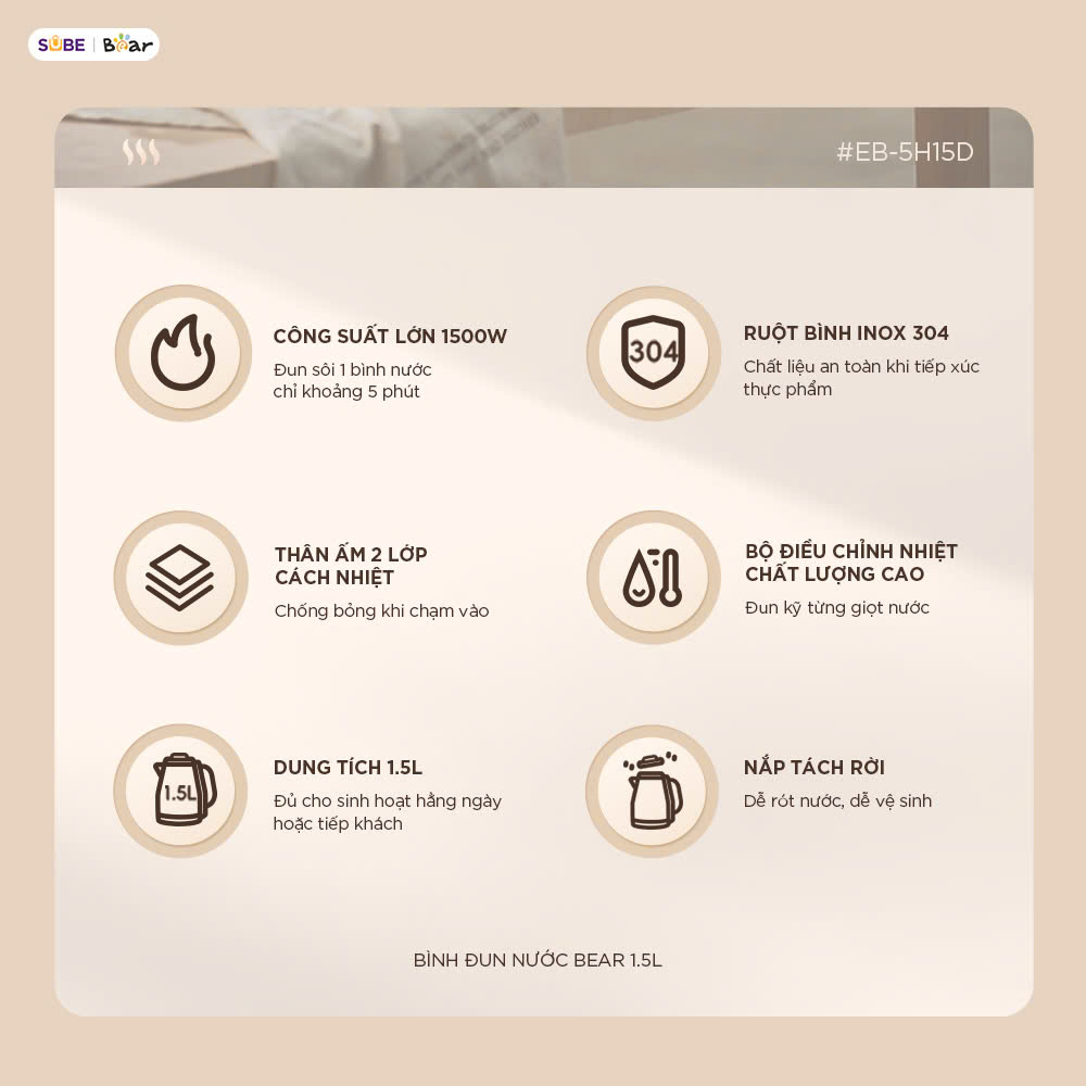 - Ấm đun nước Bear 1.5L EB-5H15D không chỉ mạnh mẽ về công năng mà còn chinh phục người dùng bởi thiết kế hiện đại, tinh tế: