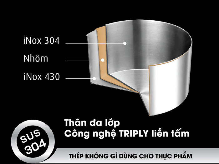 Thân nồi Triply 3 lớp giúp thức ăn chín đều, giữ trọn hương vị.
