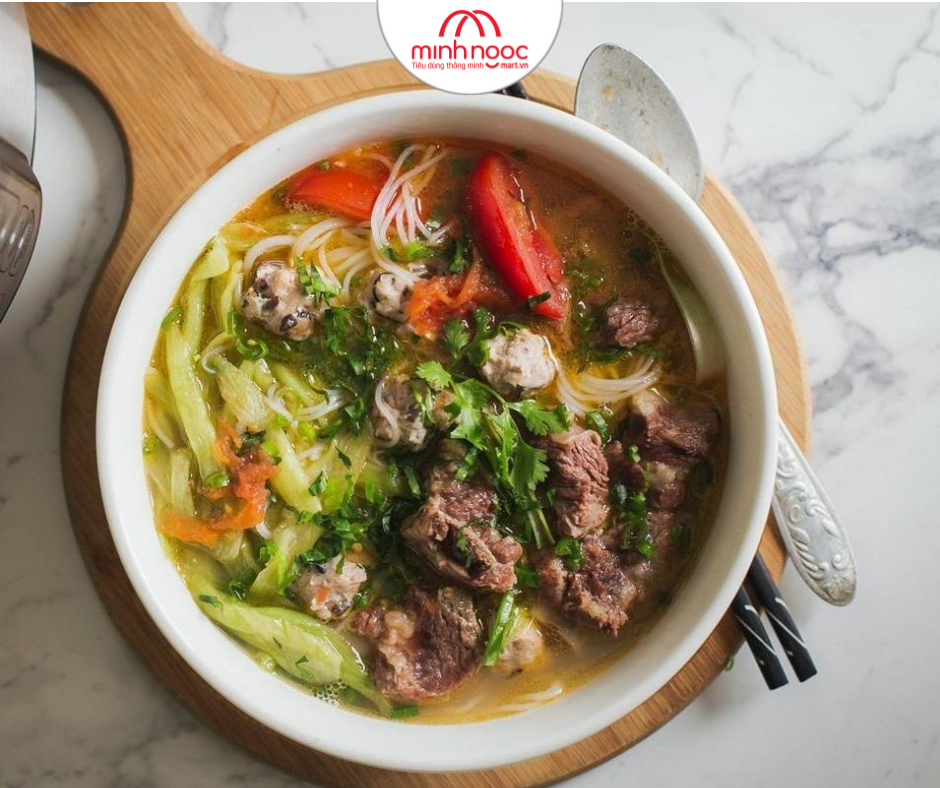 Xếp thịt mọc, sườn, dọc mùng, hành mùi thái nhỏ lên trên. Chan nước dùng nóng trước khi ăn.