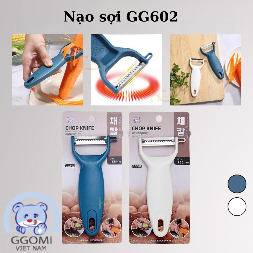 Cùng hình dáng với nạo nhỏ hồng GG601, Ggomi GG602 thiết kế lưỡi răng cưa với hai màu xanh- trắng. Có thể dùng để gọt vỏ hay bào nạo với hầu hết các loại củ và trái cây, mang lại sự thuận lợi khi sơ chế, chế biến thức ăn. Kiểu dáng đơn giản, gọn nhẹ, lưỡi bằng thép sắc bén rất dễ dàng để gọt vỏ, vừa sắc bén, lại rất sạch sẽ và vệ sinh, không han gỉ